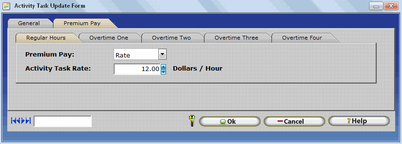 Premium Pay: Premium Pay makes it possible to define Premiums, or bonuses in the form of an increased wage. Task premiums are paid when employees work in a given task which has premiums configured. Premiums can be configured separately for the Regular, Overtime One, Overtime Two, Overtime Three, and Overtime Four hour types. This flexibility makes it possible to meet the needs of a variety of special payment premiums. Refer to the Pay Premium Introduction section of this document for more information on how Pay Premiums are calculated.