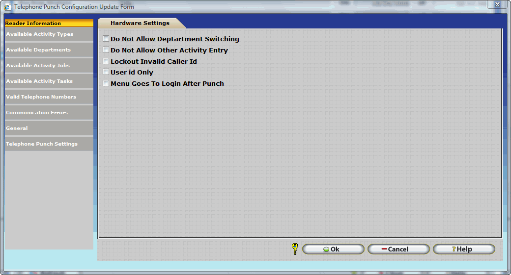 Department: Many companies purchase multiple readers and locate them throughout their facility for use with a single department. Selecting a specific department from this drop-down menu will cause InfiniTime to associate all punches from this reader to the selected department. All Departments are selected by default. Timecard Activity is automatically associated to an employees default department when All Departments is selected.
