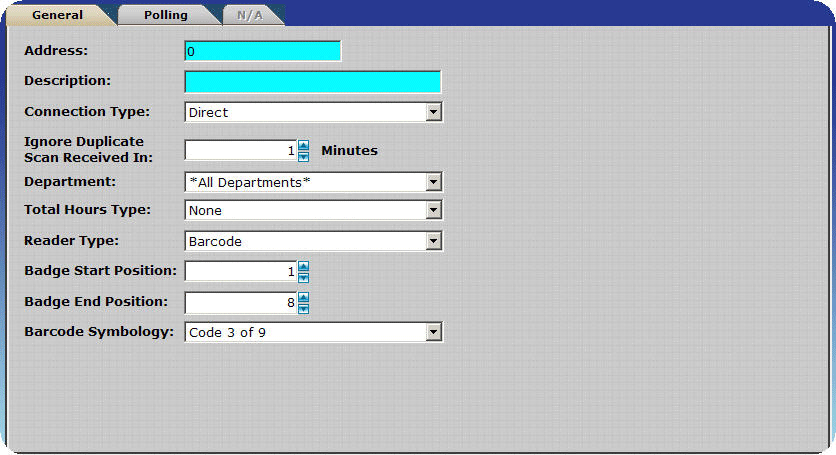 NOTE: Selecting Weekly or Pay Period can quickly fill the memory on most timeclock models. It is important to poll employee timecard activity often if either of these settings is selected.: Enter the Reader Address assigned to the clock during setup. Refer to the section of this document that corresponds to your specific timeclock model for setup instructions.